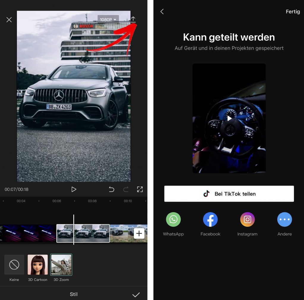 Alle Fotos bearbeitet, ausgerichtet und bereit für die Weiten des Internets? Dann kannst du mit ein paar wenigen Klicks schon dein Video Exportieren und auf einer Platform deiner Wahl teilen, beziehungsweise mit der Option Andere in deiner Galerie Speichern etc.: