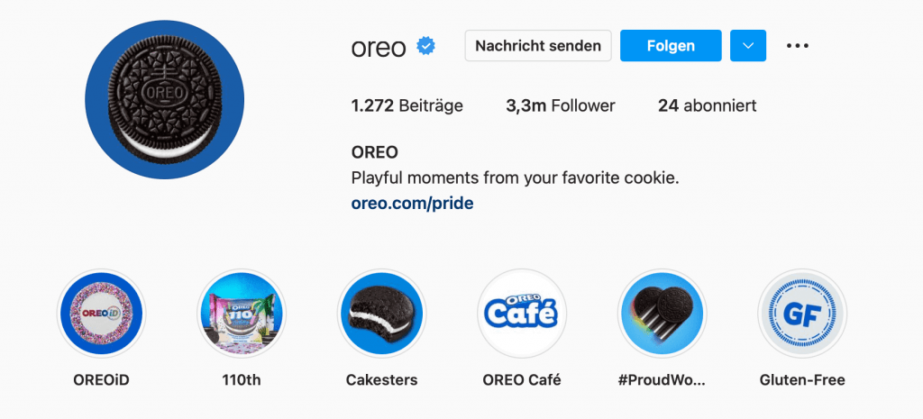 Oreo: ein Meister im Kurzfassen. Der bekannte Kekshersteller profitiert von dem Fakt, dass er schon eine echte Marke ist. Weil er deshalb nicht viel erklären muss, reicht der Verweis auf die eigene Website sowie ein kurzer Satz über die Firma selbst. Ergänzend gibt es viele, viele Story-Highlights!
