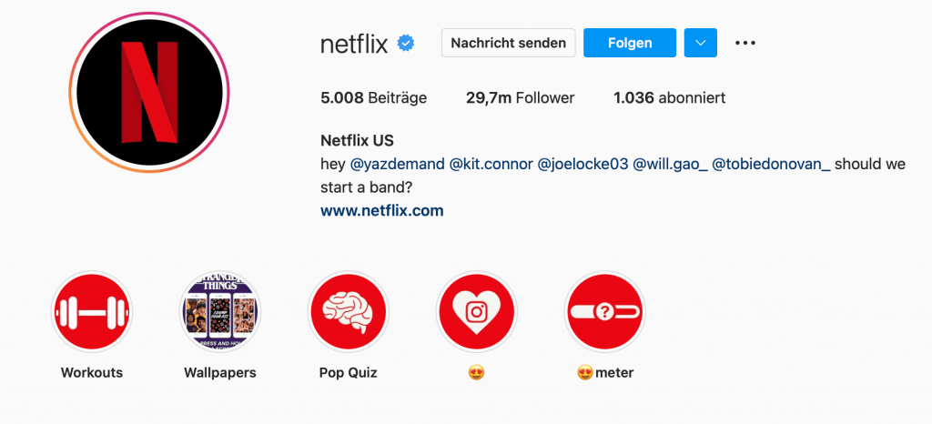 Netflix: Äußerst bekannt, muss auch Netflix kaum noch erklären, wer man ist. Deshalb verwendet der Streaminganbieter wechselnde Tags, um aktuelle Serien und Filme zu promoten. Emojis werden eher sparsam eingesetzt.