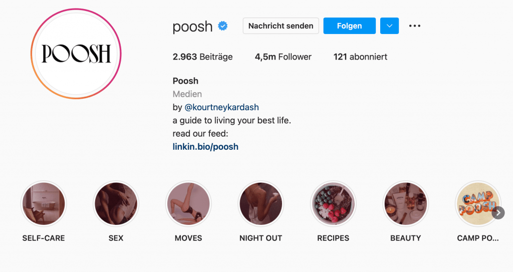 Poosh: nutzt den Call to Action und zeigt her, was man hat. Verlinkt zudem per „@“ die Gründer. Hier werden weit weniger als die üblichen 150 Zeichen genutzt. Das funktioniert sogar ganz ohne Emojis! Masse ist eben nicht immer gleich Klasse.